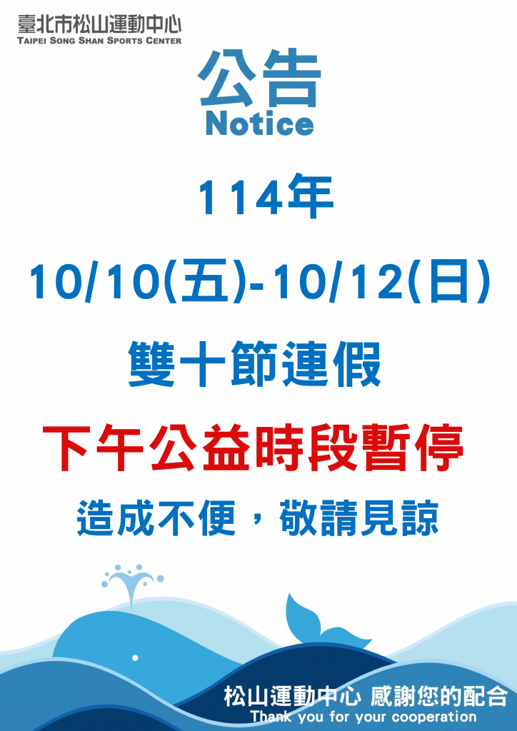 【公告】114年10/10(五)-10/12(日) 下午公益時段暫停
