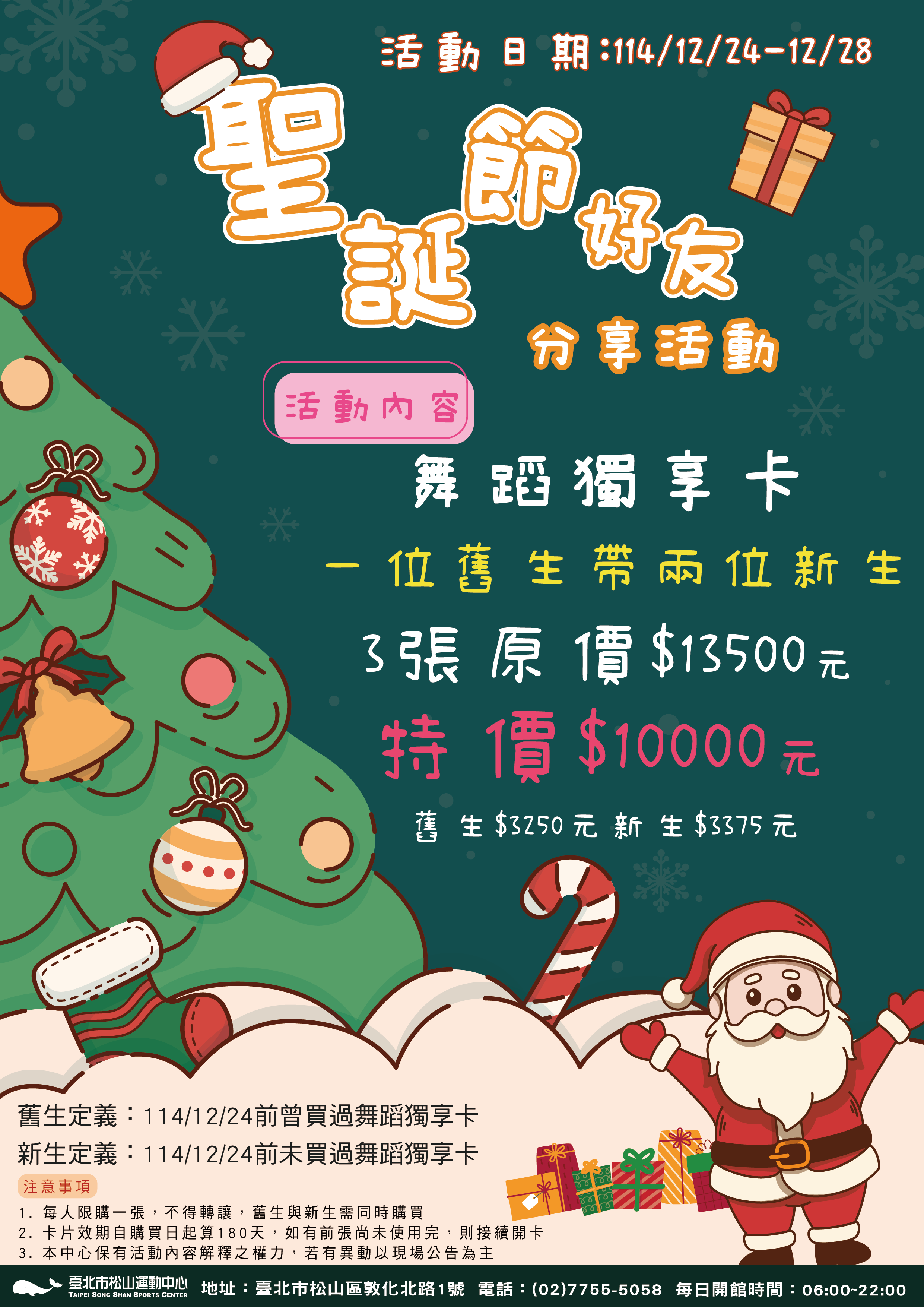 ::: 【活動】聖誕節好友分享活動 15 12 月, 2025促銷 活動日期 : 114/12/24-12/28 活動內容 : 舞蹈獨享卡一位舊生帶兩位新生 3張原價$13500元,特價$10000元 (舊生$3250元、新生$3375元) 注意事項 : 1. 每人限購一張,不得轉讓,舊生與新生需要同時購買 2. 卡片效期自購買日起算180天,如有前張尚未使用完,則接續開卡 3. 本中心保有更改活動內容及解釋之權力,若有異動依現場公告為主