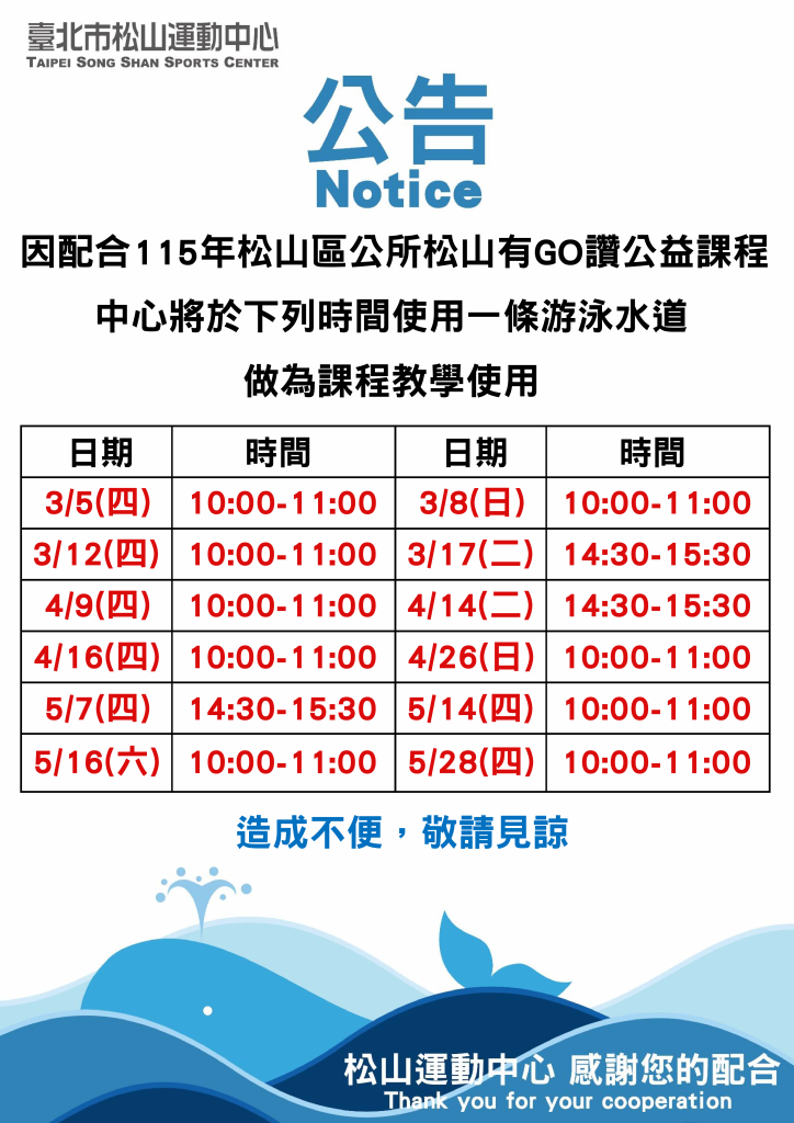 中心將於下列時間使用一條游泳水道做為課程教學使用