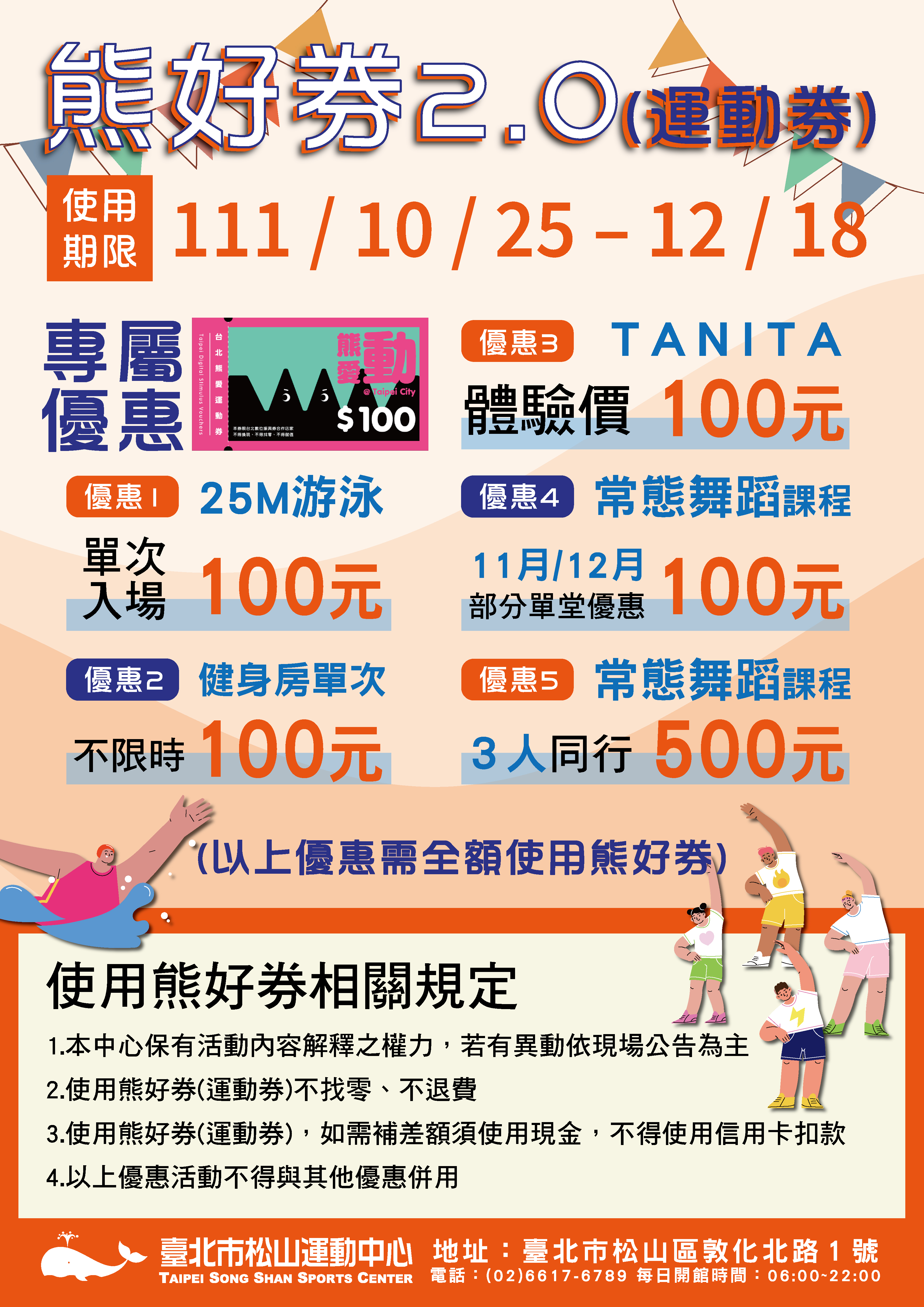 ::: 【活動】熊愛動(運動券) 12 12 月, 2022活動 熊好券最後倒數一週囉 手上還有沒使用完的朋友們 趕快加緊時間來松運囉~~~ 有效期限至12/18(日) 使用熊好券相關規定 1.本中心保有活動內容解釋之權力,若有異動依現場公告為主 2.使用熊好券(運動券)不找零、不退費 3.使用熊好券(運動券),如需補差額須使用現金,不得使用信用卡扣款 4.以上優惠活動不得與其他優惠併用