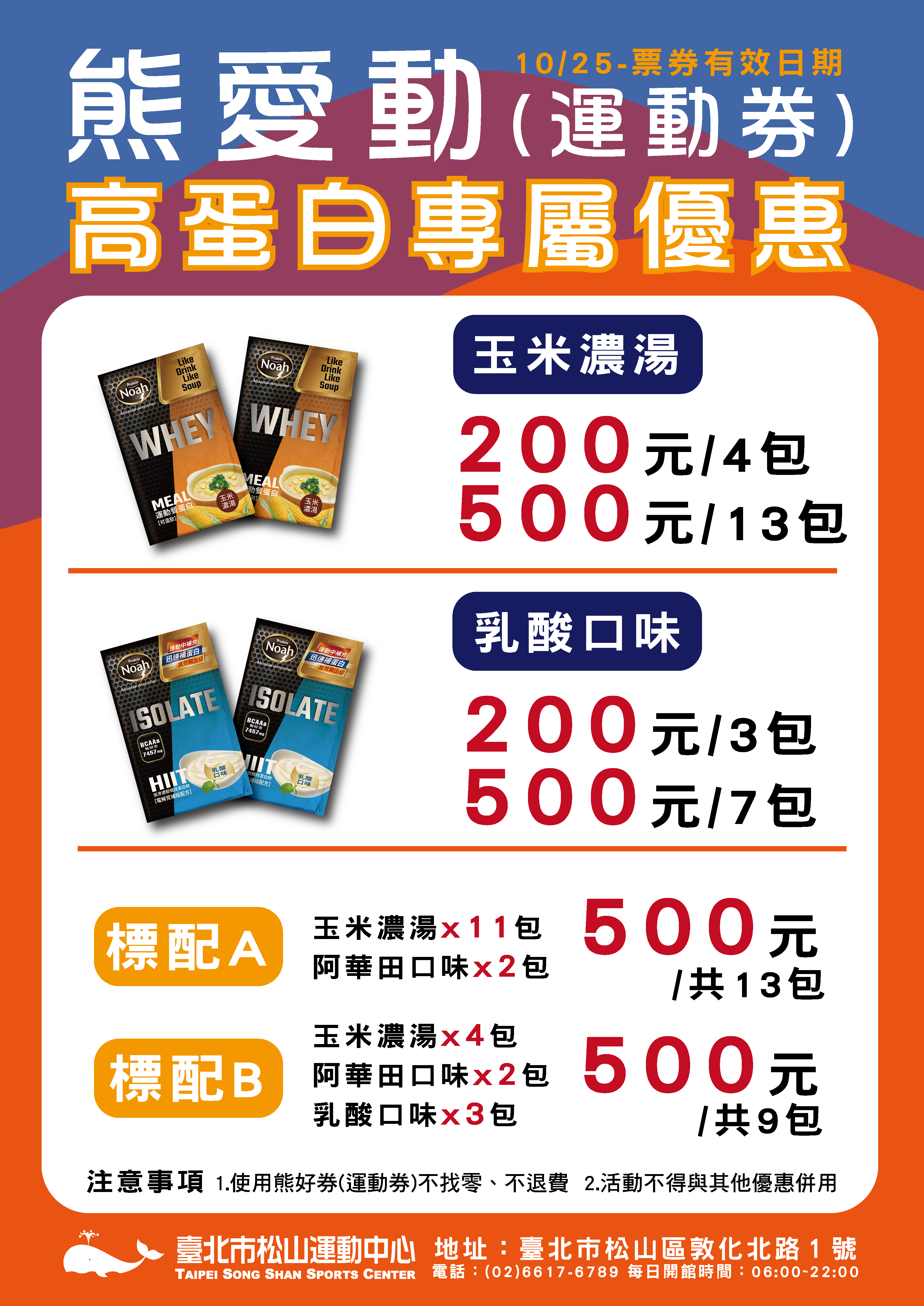 ::: 【快閃活動】2023/3/9-3/15 9 3 月, 2023活動 活動一.買乳清蛋白(乳酸口味一包或玉米濃湯二包) 送單次入場 25M泳池或健身房2小時 活動二.全館消費加購乳清蛋白5折(不限包數,美津濃專櫃不適用) 注意事項 購買後,不予退換。本中心保有活動更改及解釋內容之權利,若有異動以現場公告為主。